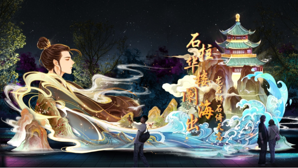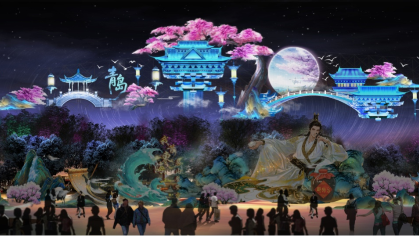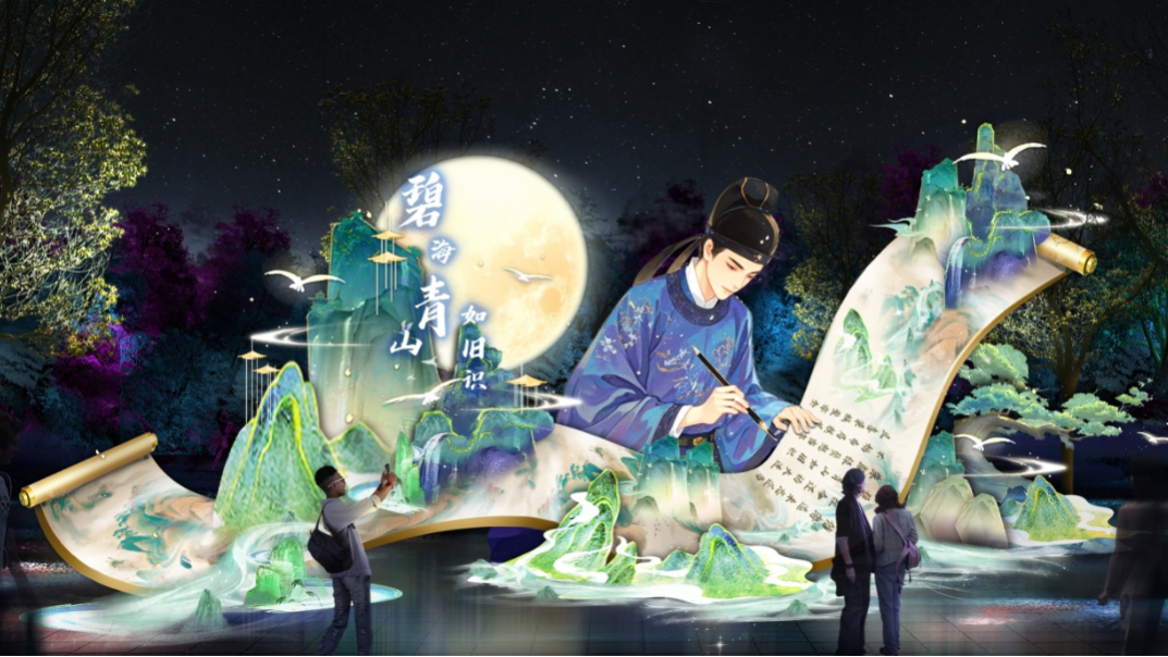 以青島的詩詞文脈為紐帶,融合嶗山山水、傳統(tǒng)建筑與現(xiàn)代光雕技術(shù),將歷代文人墨客筆下的山海神韻,化作流光溢彩的燈組在光影中徐徐鋪展。