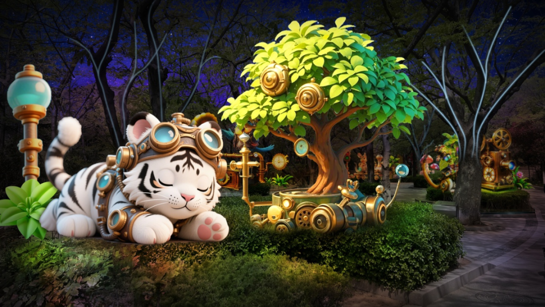該區(qū)域位于動(dòng)物園園區(qū)內(nèi),由“蒸汽時(shí)代”“時(shí)空回廊”“萌趣光廊”“童夢(mèng)繪星河”“幻彩童夢(mèng)”“幻羽仙鵝”等燈組組成。