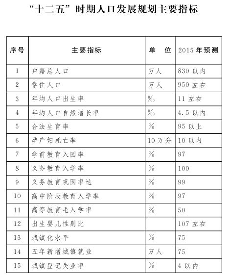 低生育水平保持穩(wěn)定,人口得到全面發(fā)展,服務(wù)優(yōu)質(zhì)、導(dǎo)向明確、制度完備、管理規(guī)范、保障有力的人口和計(jì)劃生育管理服務(wù)體系更加完善,為建設(shè)人力資源強(qiáng)市提供基礎(chǔ)性支撐。“十二五”期末,全市常住人口達(dá)到950萬左右,戶籍總?cè)丝诳刂圃?30萬以內(nèi);年均人口出生率控制在11‰左右,年均人口自然增長率不超過4.5‰。人口結(jié)構(gòu)得到改善,勞動(dòng)力人口比例保持在73%以上;人口性別結(jié)構(gòu)更加合理,出生人口性別比控制在正常范圍。人口素質(zhì)普遍提高,人才隊(duì)伍進(jìn)一步壯大,高等教育毛入學(xué)率達(dá)到50%左右,大專及以上文化程度人口、高技能勞動(dòng)者所占比例達(dá)到40%以上,市民預(yù)期壽命達(dá)到80歲以上;出生人口缺陷發(fā)生率和嬰兒死亡率維持在較低水平;人口布局更加合理,人口城鎮(zhèn)化水平達(dá)到75%。計(jì)劃生育優(yōu)質(zhì)服務(wù)提質(zhì)提速,技術(shù)服務(wù)功能依法規(guī)范拓展,服務(wù)范圍穩(wěn)步擴(kuò)大,技術(shù)保障能力不斷增強(qiáng),群眾生殖健康水平不斷提高,全市人口和計(jì)劃生育技術(shù)服務(wù)實(shí)現(xiàn)全覆蓋。完善人口和計(jì)劃生育獎(jiǎng)勵(lì)、救助與優(yōu)先優(yōu)惠等利益導(dǎo)向政策,保障計(jì)劃生育家庭優(yōu)先分享改革發(fā)展成果。人口和計(jì)劃生育社會(huì)管理和公共服務(wù)能力得到提高,人居環(huán)境進(jìn)一步改善,基本公共服務(wù)更加均等,家庭發(fā)展能力得到增強(qiáng)。