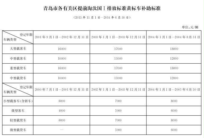2.青島市各有關(guān)區(qū)提前淘汰國Ⅰ排放標(biāo)準(zhǔn)黃標(biāo)車補(bǔ)助標(biāo)準(zhǔn)(2014年7月1日—12月31日)