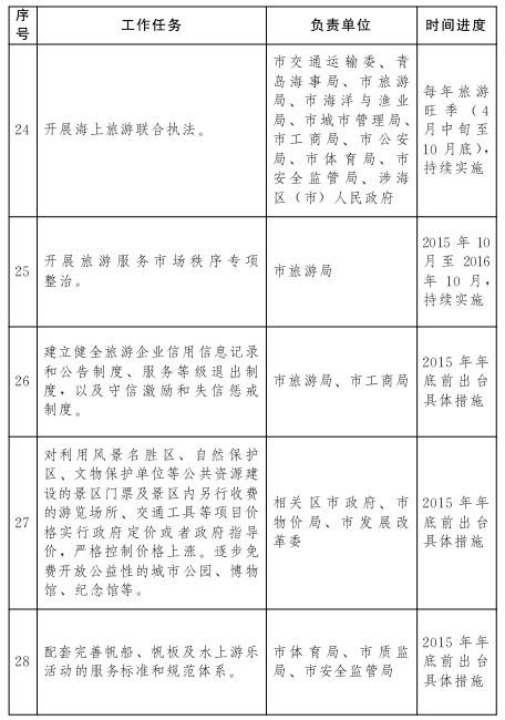 ?。ㄒ唬┩七M(jìn)依法治旅。完善綜合監(jiān)管機(jī)制,全面優(yōu)化旅游市場環(huán)境,強(qiáng)化“一日游”管理,開展海上旅游聯(lián)合執(zhí)法和旅游服務(wù)市場秩序?qū)m?xiàng)整治,運(yùn)用信息化手段努力提高旅游市場監(jiān)管、旅游執(zhí)法水平和投訴處理能力。建立健全旅游企業(yè)信用信息記錄和公告制度、服務(wù)等級退出制度、守信激勵(lì)和失信懲戒機(jī)制,加強(qiáng)行業(yè)自律和輿論監(jiān)督。著力提高旅游從業(yè)人員的文明意識、形象意識和環(huán)境意識,進(jìn)一步落實(shí)游客不文明行為記錄制度,積極開展旅游志愿者義務(wù)服務(wù),提升公民出游文明素質(zhì)。對利用風(fēng)景名勝區(qū)、自然保護(hù)區(qū)、文物保護(hù)單位等公共資源建設(shè)的景區(qū)及景區(qū)內(nèi)另行收費(fèi)的游覽場所、交通工具等項(xiàng)目價(jià)格實(shí)行政府定價(jià)或者政府指導(dǎo)價(jià),嚴(yán)格控制價(jià)格上漲,逐步免費(fèi)開放公益性的城市公園、博物館、紀(jì)念館等。配套完善帆船、帆板及水上游樂活動(dòng)的服務(wù)標(biāo)準(zhǔn)和規(guī)范體系。有效落實(shí)機(jī)場口岸72小時(shí)過境免簽政策和境外游客購物離境退稅政策。