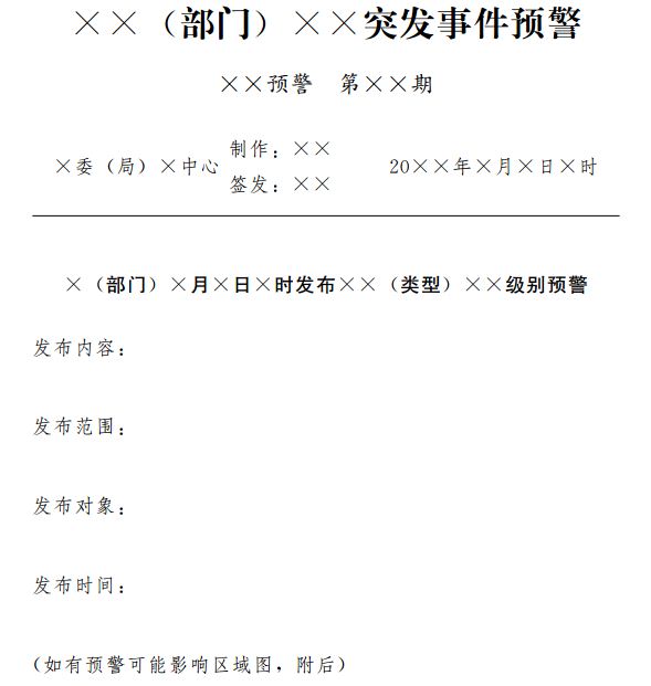 第九條 預(yù)警信息制作由預(yù)警信息發(fā)布責(zé)任單位負(fù)責(zé),主要內(nèi)容包括發(fā)布單位、發(fā)布時(shí)間、起始時(shí)間、預(yù)警類型、發(fā)生或可能發(fā)生的突發(fā)事件預(yù)警級別、可能影響范圍、警示事項(xiàng)、建議措施等,采用統(tǒng)一格式(見附件)。多部門聯(lián)合發(fā)布預(yù)警信息時(shí),需經(jīng)相關(guān)部門會簽同意,并由牽頭單位負(fù)責(zé)辦理。