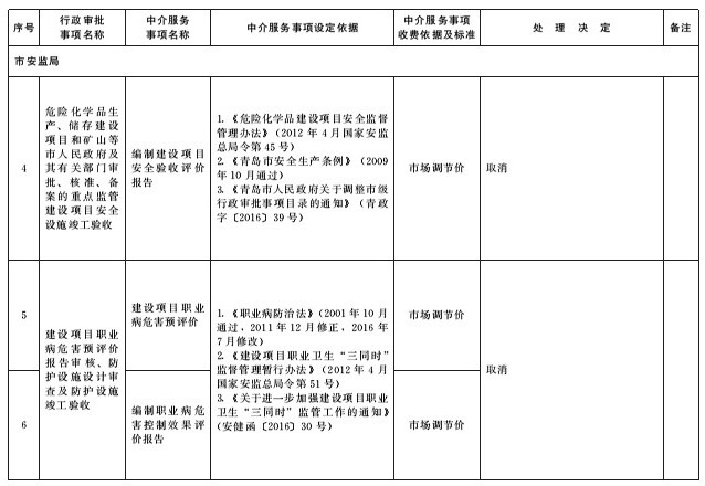 按照國務(wù)院《關(guān)于第二批清理規(guī)范192項國務(wù)院部門行政審批中介服務(wù)事項的決定》(國發(fā)〔2016〕11號)和省政府《關(guān)于清理規(guī)范省直部門(單位)行政審批中介服務(wù)收費項目的通知》(魯政字〔2016〕107號)要求,根據(jù)市政府《關(guān)于調(diào)整市級行政審批事項目錄的通知》(青政字〔2016〕39號)中行政審批事項調(diào)整情況,對市政府《關(guān)于公布青島市市級行政審批中介服務(wù)事項清單的通知》(青政字〔2015〕133號)公布的“市級行政審批中介服務(wù)事項清單”(以下簡稱清單)和“市級非強制的行政審批中介服務(wù)事項”(以下簡稱事項)進行調(diào)整,其中不再納入清單管理的中介服務(wù)事項7項,新納入清單管理的中介服務(wù)事項1項;不再納入事項管理的中介服務(wù)事項2項,新納入事項管理的中介服務(wù)事項4項?,F(xiàn)予以公布,自公布之日起實施。