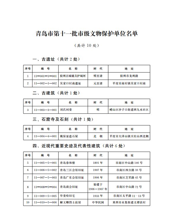 《青島市第十一批市級文物保護(hù)單位名單》已經(jīng)市政府同意,現(xiàn)予以公布。