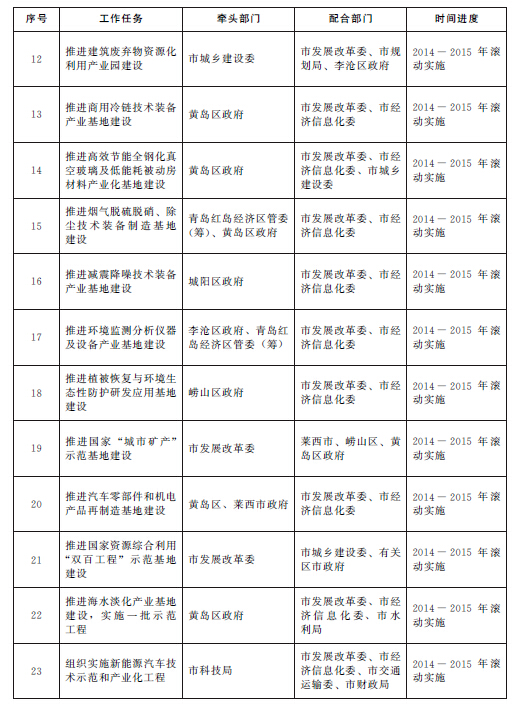 三、實施節(jié)能環(huán)保重點工程。加快推進(jìn)節(jié)能技術(shù)與裝備產(chǎn)業(yè)化工程,培育壯大永磁電機、高壓變頻控制、無功補償?shù)雀咝щ姍C及其控制系統(tǒng)產(chǎn)業(yè)集群,培育發(fā)展高效換熱器、余熱鍋爐、鍋爐除渣系統(tǒng)、生物質(zhì)鍋爐、燃?xì)忮仩t等產(chǎn)業(yè)集群,建設(shè)萬噸級非晶帶材產(chǎn)業(yè)園,培育全球一流的冷鏈裝備和服務(wù)供應(yīng)商,建設(shè)集產(chǎn)學(xué)研為一體的商用冷鏈技術(shù)裝備產(chǎn)業(yè)基地和冷鏈高新產(chǎn)業(yè)園區(qū),以及高效節(jié)能全鋼化真空玻璃及低能耗被動房材料產(chǎn)業(yè)化基地,組織實施新能源汽車技術(shù)示范及產(chǎn)業(yè)化工程。繼續(xù)推進(jìn)千億級家電產(chǎn)業(yè)鏈工程,依托國家級和省級家電電子產(chǎn)業(yè)示范基地建設(shè),形成產(chǎn)業(yè)聚集,促進(jìn)節(jié)能家電產(chǎn)業(yè)跨越式發(fā)展。加快推進(jìn)環(huán)保技術(shù)與裝備產(chǎn)業(yè)化工程,培育煙氣脫硫、除塵、減震降噪、智能型煙塵/大氣監(jiān)測分析儀器等技術(shù)裝備制造基地,建設(shè)植被恢復(fù)與環(huán)境生態(tài)性防護(hù)研發(fā)應(yīng)用基地。開展綠色建筑行動,嚴(yán)格執(zhí)行新建建筑節(jié)能標(biāo)準(zhǔn),推動綠色建筑快速發(fā)展。扎實推進(jìn)既有居住建筑供熱計量和節(jié)能改造,加強公共建筑節(jié)能監(jiān)管。到2015年,建成綠色建筑800萬平方米以上,完成40%以上具備改造價值的既有居住建筑節(jié)能改造。大力發(fā)展綠色建材,推進(jìn)可再生能源建筑規(guī)?;瘧?yīng)用;發(fā)展建筑產(chǎn)業(yè)化,扶持建筑產(chǎn)業(yè)化生產(chǎn)基地建設(shè),推廣裝配式建筑。加快推進(jìn)海洋環(huán)保產(chǎn)業(yè)示范工程,培育全國領(lǐng)先的海洋環(huán)保產(chǎn)業(yè)技術(shù)裝備研發(fā)高地和產(chǎn)業(yè)化示范中心,引進(jìn)國內(nèi)外知名企業(yè)完善相關(guān)產(chǎn)業(yè)鏈,實現(xiàn)海洋環(huán)保產(chǎn)業(yè)集聚發(fā)展。加快推進(jìn)再制造和循環(huán)利用產(chǎn)業(yè)化工程,推進(jìn)汽車零部件和機電產(chǎn)品再制造,完善再生資源回收體系建設(shè),推進(jìn)國家“城市礦產(chǎn)”示范基地和建筑廢棄物綜合利用“雙百工程”示范基地建設(shè),建設(shè)廢舊輪胎資源化利用產(chǎn)業(yè)園和建筑廢棄物資源化利用產(chǎn)業(yè)園。加快海水淡化產(chǎn)業(yè)基地建設(shè),推進(jìn)實施一批工業(yè)用海水示范工程,逐步推進(jìn)海水淡化水民用工作,依法有序推動海水淡化水進(jìn)入市政供水系統(tǒng)。加快推進(jìn)節(jié)能環(huán)保服務(wù)業(yè)培育工程,創(chuàng)新服務(wù)模式,培育一批合同能源管理、污染治理設(shè)施一體化運營、節(jié)能環(huán)保評估和審查、清潔生產(chǎn)審核、能源和環(huán)境管理體系認(rèn)證、法律咨詢、崗位資格培訓(xùn)等集成化專業(yè)化公司,形成一批節(jié)能環(huán)保服務(wù)業(yè)聚集區(qū)。