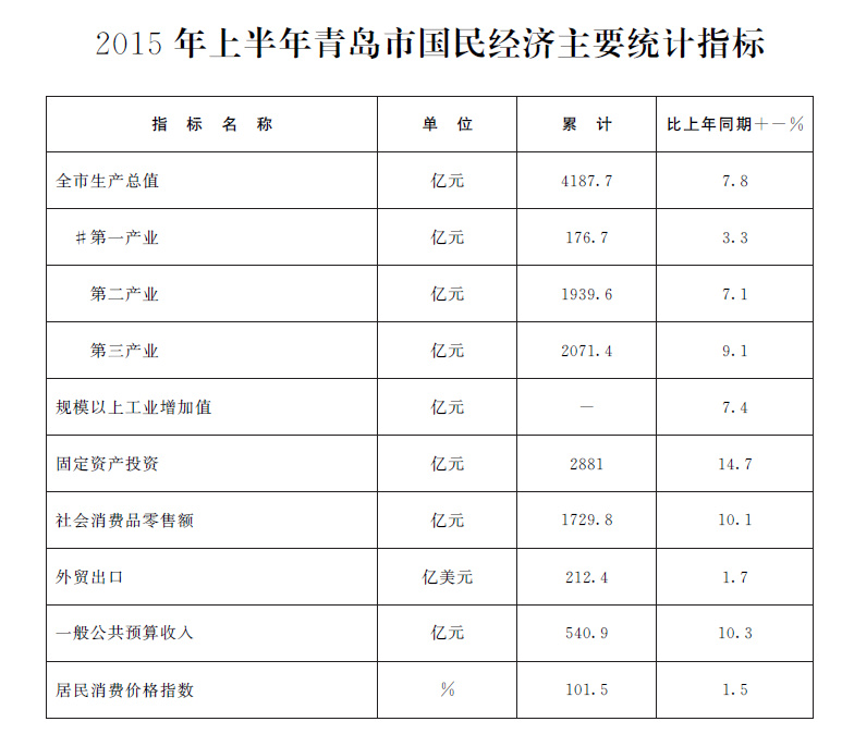 2015年上半年青島市國民經(jīng)濟(jì)主要統(tǒng)計(jì)指標(biāo)
