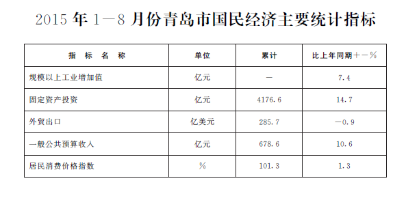 2015年1-8月份青島市國民經(jīng)濟(jì)主要統(tǒng)計(jì)指標(biāo)