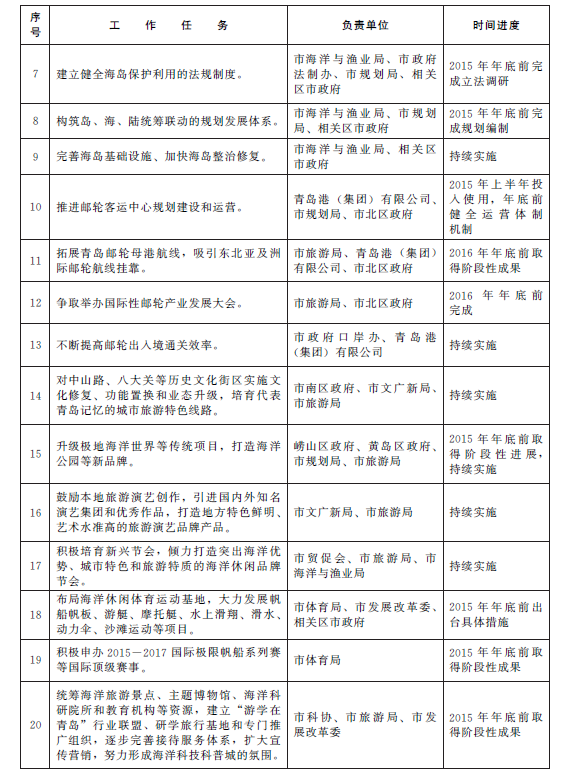 ?。ㄎ澹┌l(fā)展海洋體育旅游。布局海洋休閑體育運(yùn)動基地,大力發(fā)展帆船帆板、游艇、摩托艇、水上滑翔、滑水、動力傘、沙灘運(yùn)動等項目。舉辦好2015-2016世界杯帆船賽、克利伯環(huán)球帆船賽青島站活動等重點(diǎn)賽事,積極申辦2015-2017國際極限帆船系列賽等國際頂級賽事。探索和完善大型體育賽事的市場開發(fā)和運(yùn)作模式,努力打造2至3個國際國內(nèi)高端帆船賽事自主品牌。深入開展全民帆船普及活動,推廣帆船賽事觀賞、帆船體驗和帆船培訓(xùn)等特色旅游產(chǎn)品,促進(jìn)競賽表演、健身休閑與旅游活動的結(jié)合。