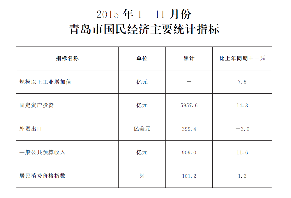 2015年1-11月份青島市國(guó)民經(jīng)濟(jì)主要統(tǒng)計(jì)指標(biāo)