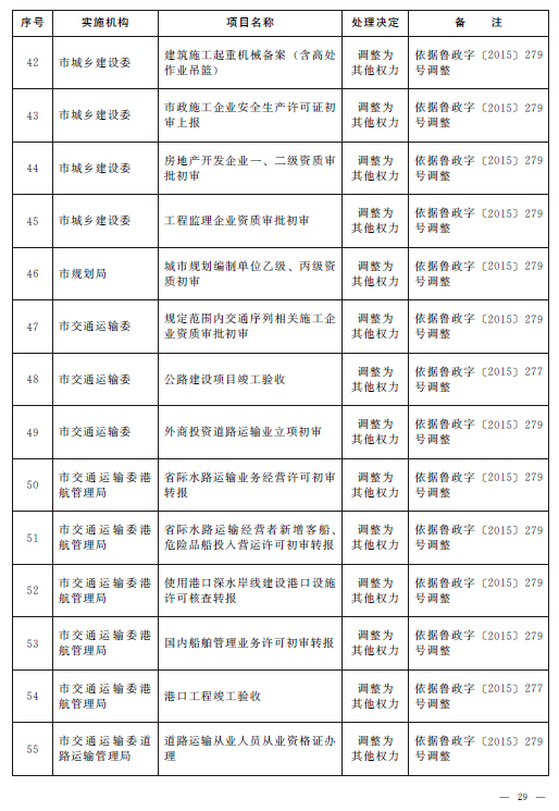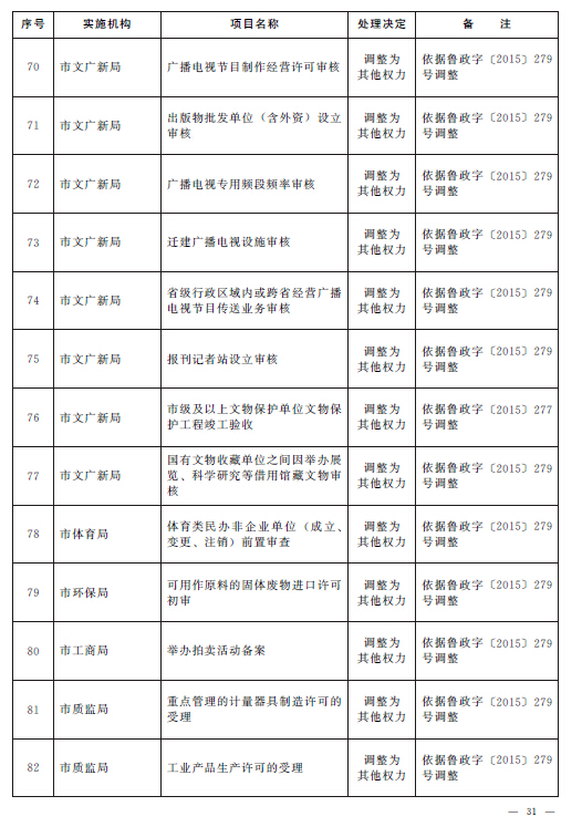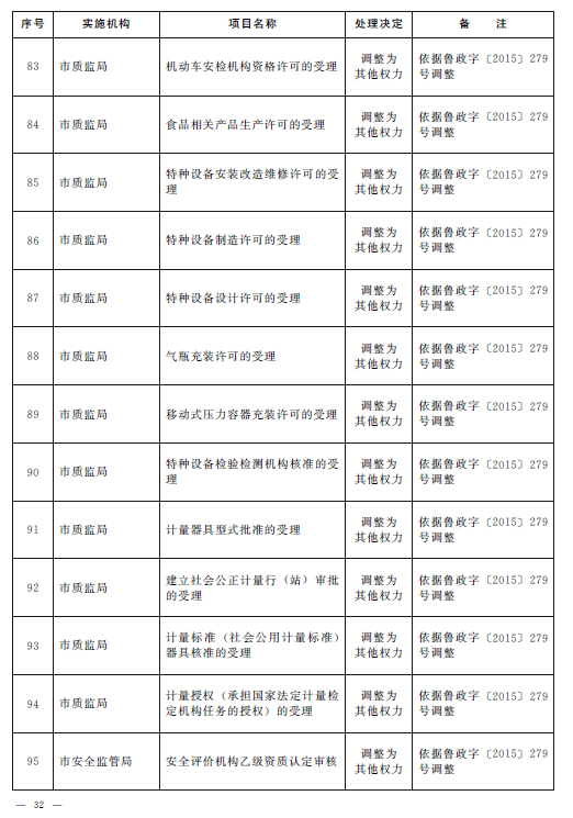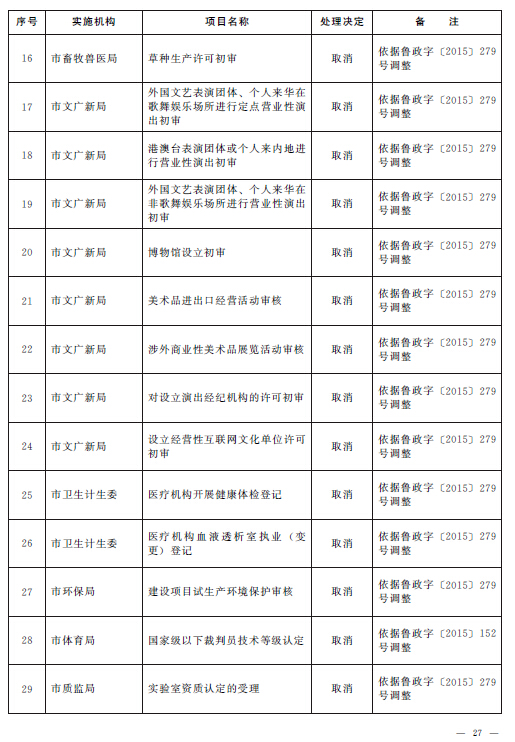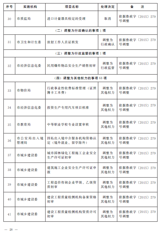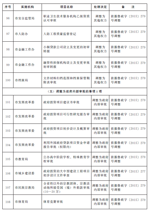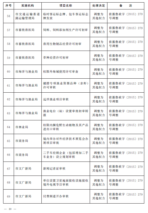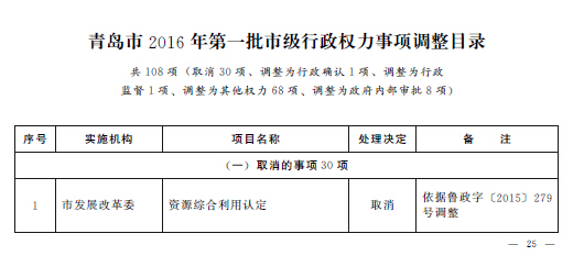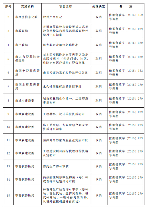 根據(jù)《山東省人民政府關(guān)于2015年第一批省級(jí)削減行政審批事項(xiàng)和承接國(guó)務(wù)院下放行政審批事項(xiàng)等項(xiàng)目的通知》(魯政字〔2015〕152號(hào))、《山東省人民政府關(guān)于2015年第二批削減省級(jí)行政審批事項(xiàng)的通知》(魯政字〔2015〕277號(hào))和《山東省人民政府關(guān)于清理市縣實(shí)施非行政許可審批事項(xiàng)有關(guān)問(wèn)題的通知》(魯政字〔2015〕279號(hào)),結(jié)合《山東省人民政府關(guān)于印發(fā)山東省行政權(quán)力清單動(dòng)態(tài)管理辦法的通知》(魯政字〔2016〕76號(hào))和《青島市人民政府關(guān)于公布青島市市級(jí)行政權(quán)力清單的通知》(青政字〔2015〕2號(hào))對(duì)市級(jí)行政權(quán)力清單實(shí)行動(dòng)態(tài)管理的要求,現(xiàn)將我市2016年第一批市級(jí)行政權(quán)力事項(xiàng)調(diào)整目錄予以公布,并自公布之日起實(shí)施。