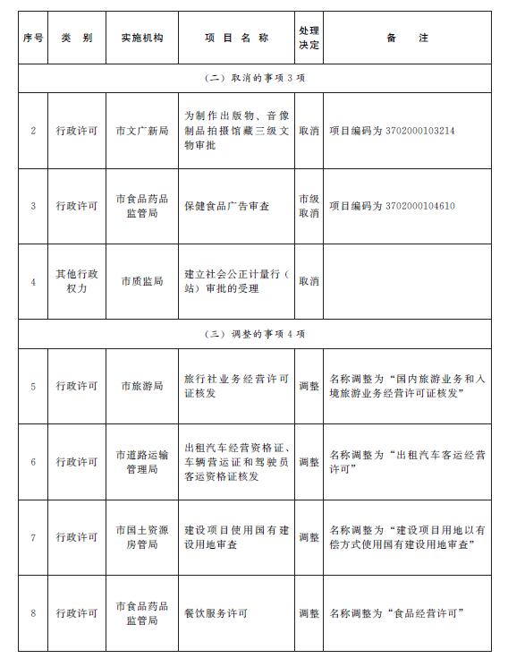 根據(jù)《山東省人民政府關(guān)于2016年第一批削減省級(jí)行政許可等權(quán)力事項(xiàng)的通知》(魯政字〔2016〕108號(hào))、《山東省人民政府審改辦關(guān)于行政許可事項(xiàng)動(dòng)態(tài)調(diào)整有關(guān)事宜的通知》(魯審改發(fā)〔2016〕3號(hào)),現(xiàn)將我市2016年第二批市級(jí)行政權(quán)力事項(xiàng)調(diào)整目錄予以公布,自公布之日起實(shí)施。
