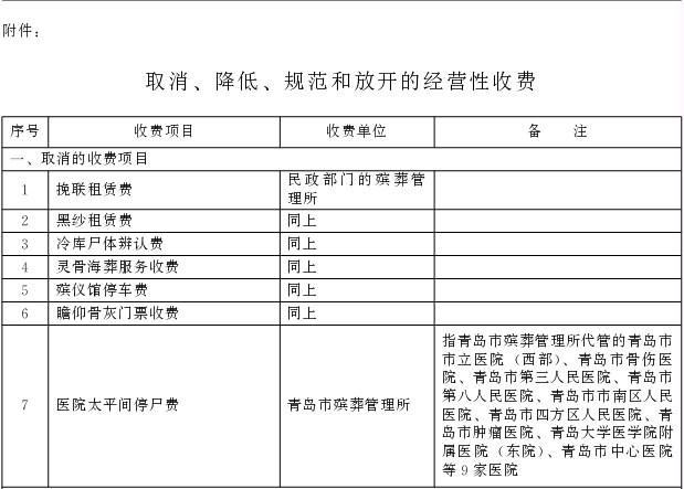 取消民政部門的殯葬管理所收取的下列殯葬服務(wù)收費(fèi)項(xiàng)目:挽聯(lián)租賃費(fèi)、黑紗租賃費(fèi)、冷庫尸體辨認(rèn)費(fèi)、靈骨海葬服務(wù)收費(fèi)、殯儀館停車費(fèi)、瞻仰骨灰門票收費(fèi)、醫(yī)院太平間停尸費(fèi)(指青島市殯葬管理所代管的9家醫(yī)院)。