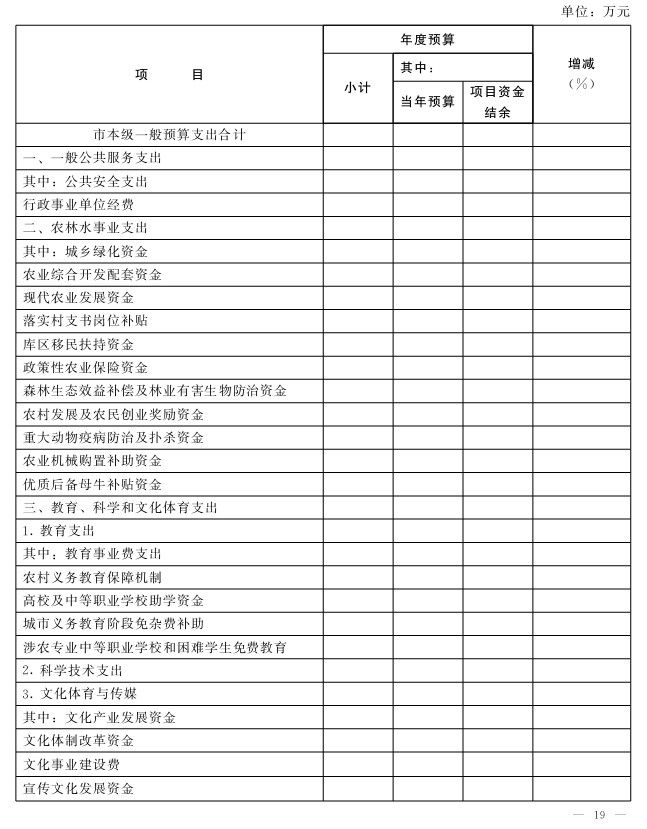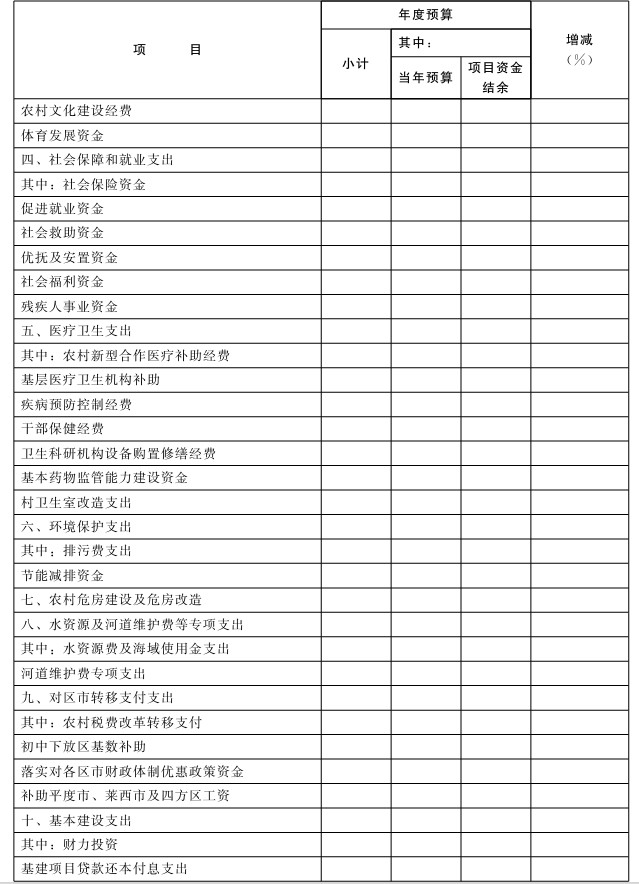 財(cái)政部門應(yīng)在市人民代表大會(huì)批準(zhǔn)當(dāng)年財(cái)政預(yù)算草案后30個(gè)工作日內(nèi),主動(dòng)公開政府財(cái)政總預(yù)算(涉密事項(xiàng)除外)。公開內(nèi)容包括政府財(cái)政預(yù)算報(bào)告、一般預(yù)算收入草案表、一般預(yù)算支出草案表、基金收入預(yù)算草案表、基金支出預(yù)算草案表等(參考表見(jiàn)附件一、二、三、四)。