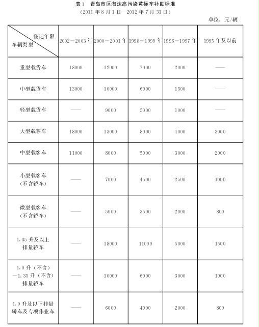 (一)2011年8月1日-2012年7月31日期間淘汰的,按照表1標(biāo)準(zhǔn)給予補(bǔ)助。