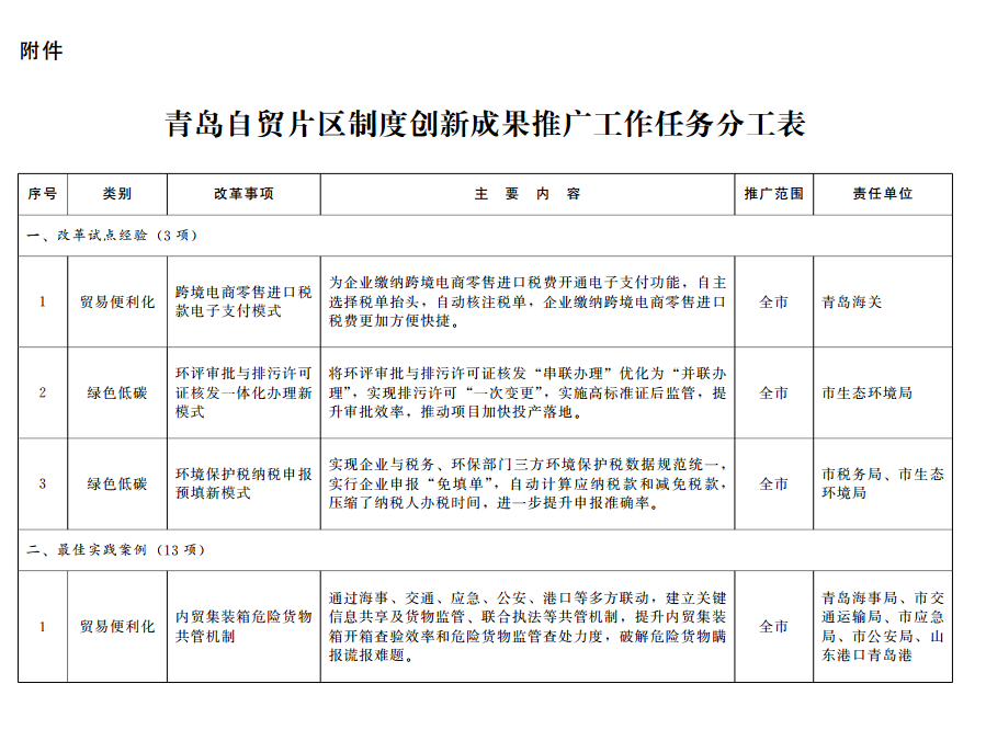 2024年以來,全市各級各部門充分發(fā)揮中國(山東)自由貿(mào)易試驗區(qū)青島片區(qū)(以下簡稱青島自貿(mào)片區(qū))改革開放試驗田作用,堅持以制度創(chuàng)新為核心,大膽試、大膽闖、自主改,全力推進自貿(mào)試驗區(qū)改革創(chuàng)新實踐,形成了新一批制度創(chuàng)新成果。經(jīng)市政府同意,16項制度創(chuàng)新成果在全市推廣?,F(xiàn)就有關事宜通知如下: