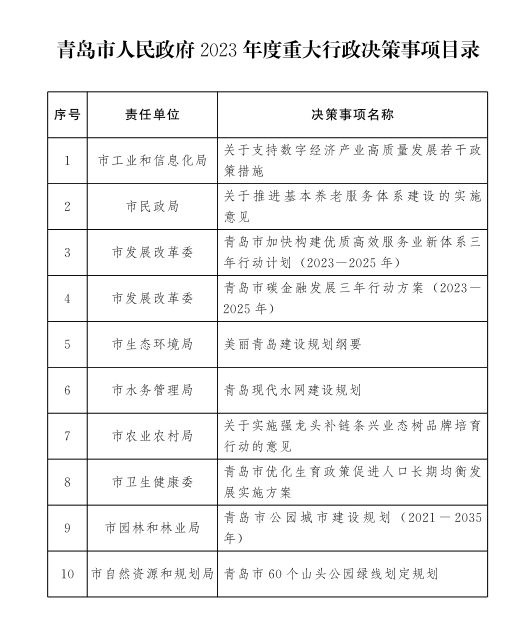 為進一步規(guī)范重大行政決策程序,促進政府科學、民主、依法決策,提高決策質量和效率,根據《青島市重大行政決策程序規(guī)定》(市政府令第271號)要求,市政府辦公廳組織市政府各部門對2023年重點工作事項進行了梳理,篩選出具有基礎性、全局性和影響面廣的10項決策事項,已經市委、市政府同意,現(xiàn)納入青島市人民政府2023年度重大行政決策事項范圍,實行目錄清單管理。列入清單管理的決策事項須于2023年11月30日前完成。各有關部門和單位要嚴格按照公眾參與、專家論證、風險評估、合法性審查的法定程序開展前期工作,并適時提交市政府常務會議研究。
