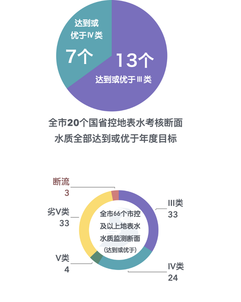 2023年,城鎮(zhèn)集中式飲用水水源地水質(zhì)達(dá)標(biāo)率100%。全市20個(gè)國(guó)省控地表水考核斷面水質(zhì)全部達(dá)到或優(yōu)于年度目標(biāo),達(dá)到或優(yōu)于Ⅲ類(lèi)13個(gè),Ⅳ類(lèi)7個(gè)。全市66個(gè)市控及以上地表水水質(zhì)監(jiān)測(cè)斷面中,斷流3個(gè),達(dá)到或優(yōu)于Ⅲ類(lèi)33個(gè),Ⅳ類(lèi)24個(gè),V類(lèi)4個(gè),劣V類(lèi)2個(gè)。五沽河、現(xiàn)河等河流水質(zhì)未達(dá)到考核目標(biāo)要求。