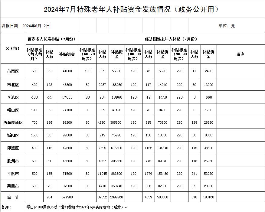 2024年7月特殊老年人補(bǔ)貼資金發(fā)放情況