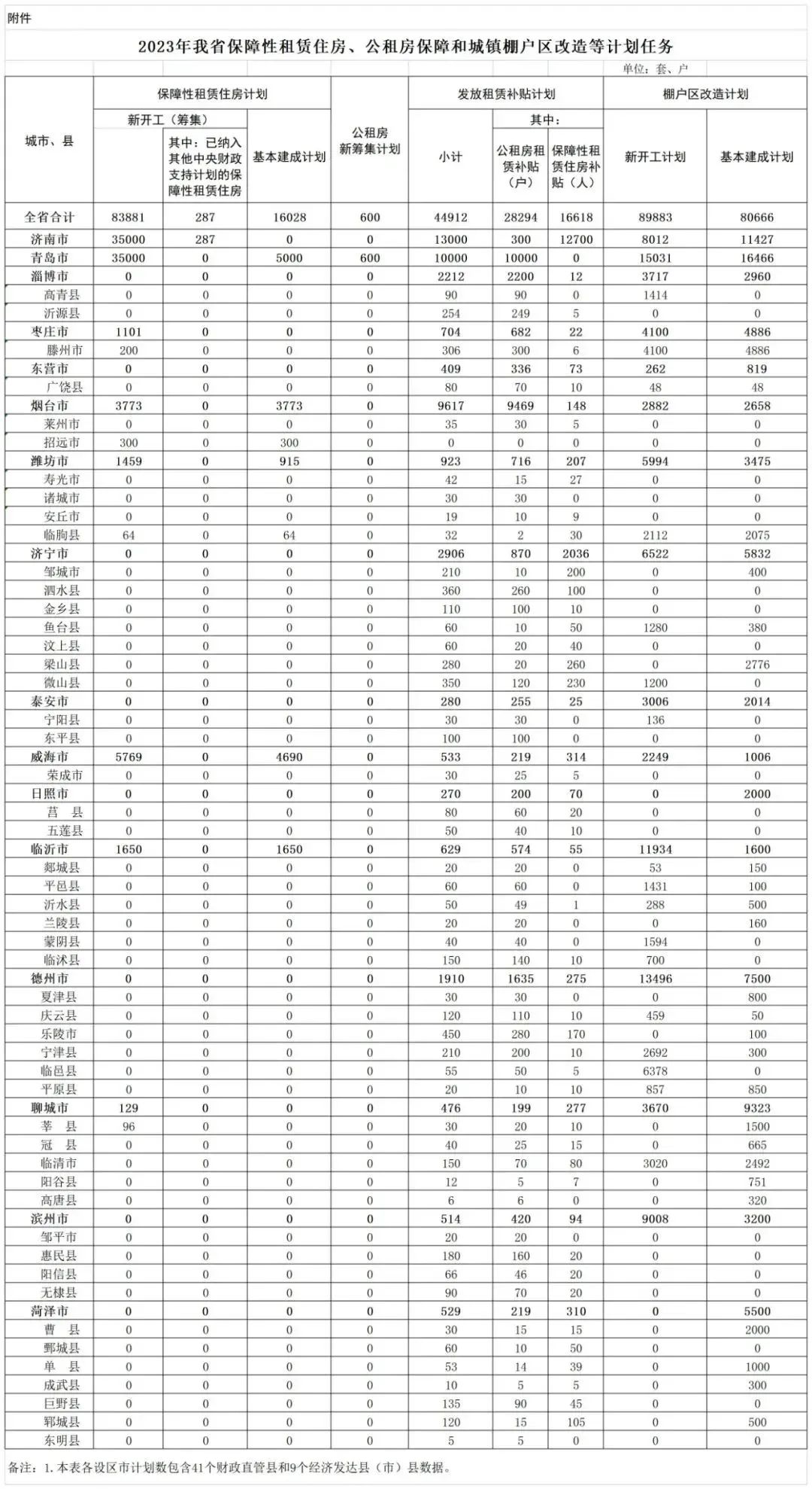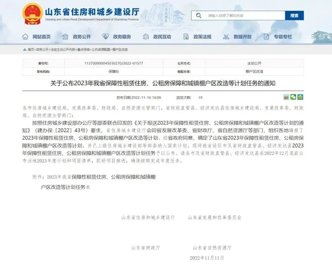 日前,山東省住房和城鄉(xiāng)建設(shè)廳官網(wǎng)發(fā)布了《關(guān)于公布2023年我省保障性租賃住房、公租房保障和城鎮(zhèn)棚戶區(qū)改造等計(jì)劃任務(wù)的通知》。